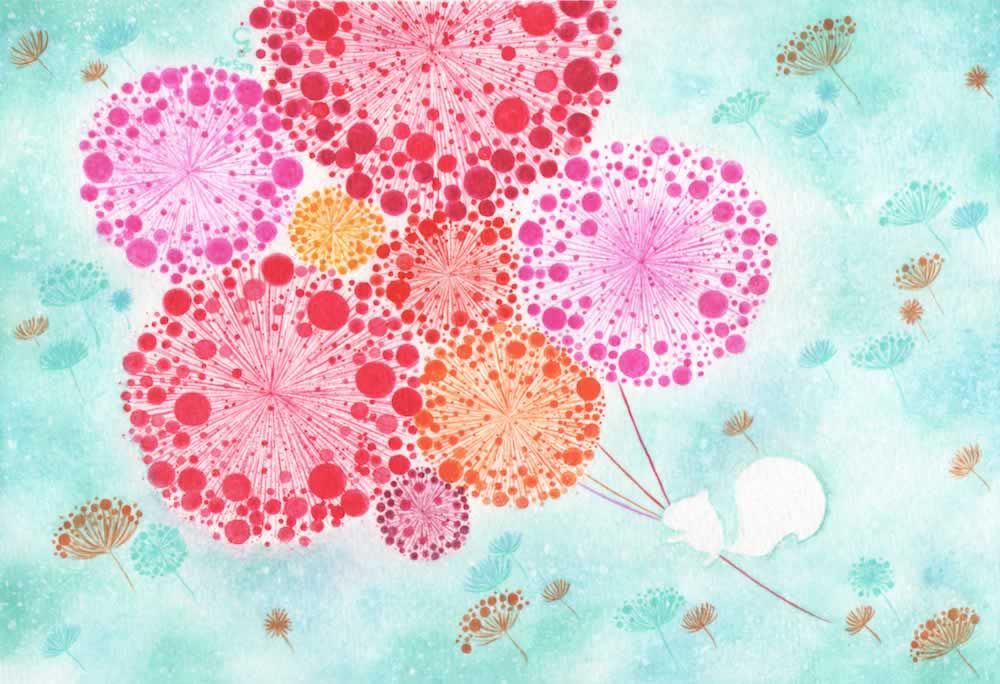 森林中的小松鼠銜著一叢花團,在克里斯多的奇幻世界中,花團幻化為氣球,帶著小松鼠飛向天際,前往裝載夢想的奇幻國度。