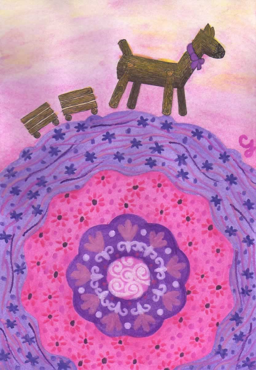 雖為克里斯多的早期作品,但卻大略詮釋了克里斯多的創作主軸:幸福感,以溫暖而療癒的色澤顯現幸福的體現,木馬可以是童年的溫馨回憶,也可以是成人世界的溫暖撫慰,不論是大朋友,還是小朋友,相信都能在這幅畫中,找到屬於自己的幸福。