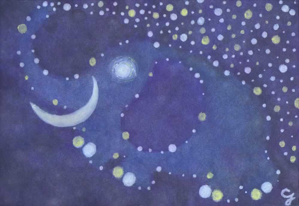 望向星空,你看見什麼?克里斯多將可愛的大象,幻化為星空的重要元素,彎彎的月亮是象牙,星星則構成大象的身體,帶來另一種專屬於克里斯多奇幻世界的魔幻詮釋。